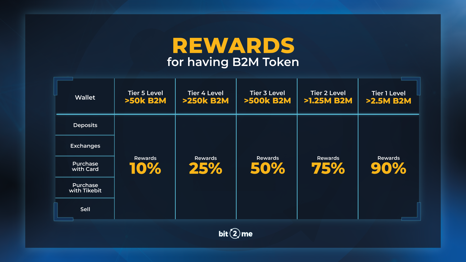 One of the main advantages of having the B2M TOKEN is the rewards that are applied in Wallet operations. Depending on the amount of tokens you have, you will be in a level called TIER. The rewards are obtained on the transaction commissions.