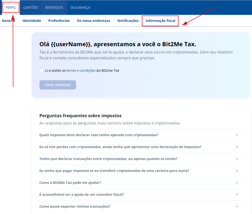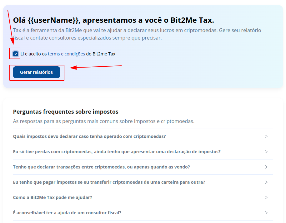 Passo 2: Na aba "Relatório de impostos", te aparecerá a ferramenta de TAX da Bit2Me. Leia e aceite os termos e condições . Em seguida, clique em "Gerar relatórios".